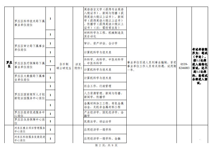 考试考核采取结构化面试、答辨、专业测试等面试方式进行(罗庄区考试方式详见附件2)。面试人员从资格审查合格人员中,根据引进计划按规定比例确定。通过资格审查的博士研究生直接进入面试环节;通过资格审查的市直事业单位硕士研究生、本科生超过岗位计划数3倍以上的,先组织面谈,根据面谈结果按1:3比例确定进入面试人选,再进行面试;县区事业单位资格审查合格人数超过50人的岗位,增加面谈环节,不超过规定人数的直接进行面试。考试考核具体办法、时间地点另行通知。