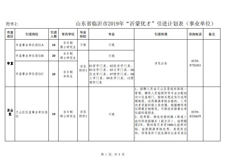 附件2:山东省临沂市2019年“沂蒙优才”引进计划表