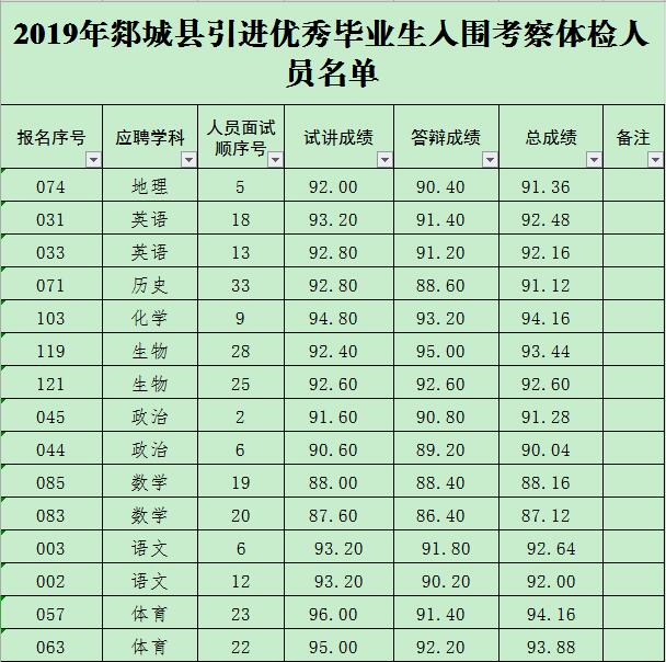 按照《2019年郯城县引进优秀毕业生公告》规定,根据面试总成绩排名、学科岗位计划按1:1的比例等额确定考察体检人选,试讲、答辩成绩中有一项低于60分的,不进入考察体检范围。现将2019年郯城县引进优秀毕业生进入考察体检范围人员名单予以公布。