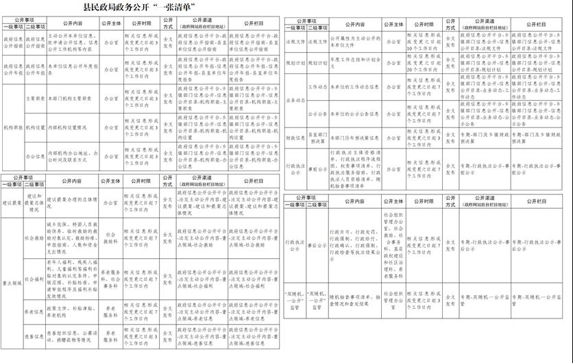 一是用心规范基层政务公开工作。全面梳理法定主动公开内容和基层政务公开事项,编制形成各级各部门政务公开工作“一张清单”,全面回答了应该公开什么内容、什么时间公开、在什么渠道公开三大问题。“一张清单”让业务工作人员学有所依、教有所据,有力破解了公开工作专业性强、人员队伍流动性大、与政务信息混淆不分的难题。