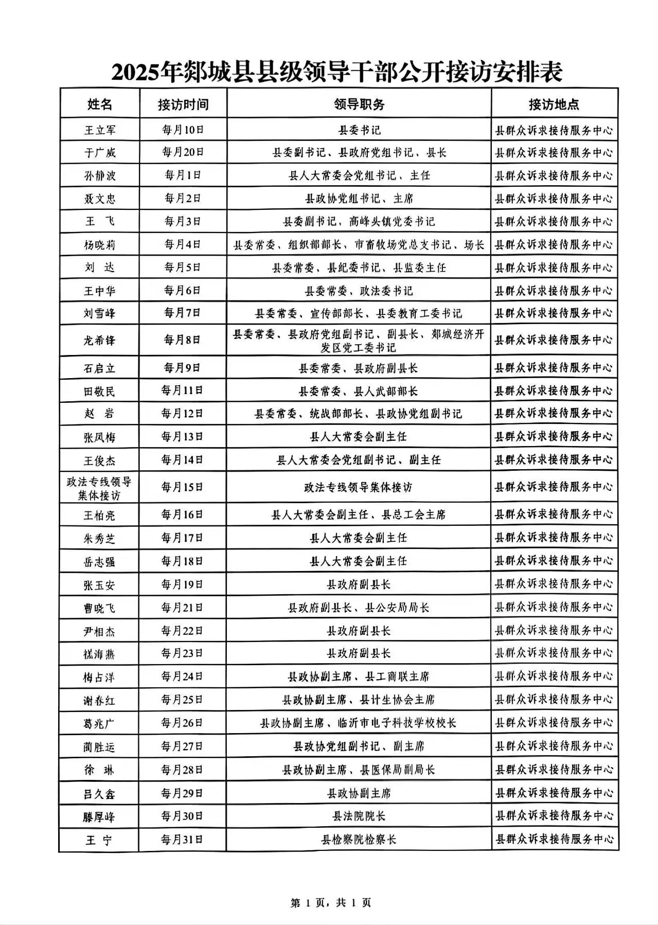 为深入贯彻落实习近平总书记关于加强和改进人民信访工作的重要思想,进一步畅通信访渠道,依法及时就地解决群众合理诉求,现将郯城县县级领导干部公开接访时间安排公告如下: