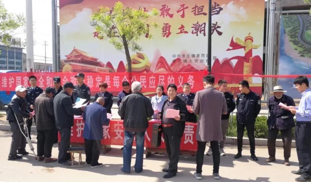 为进一步提升李庄镇辖区群众国家安全意识,让群众深入了解和掌握国家安全知识,增强群众国家安全责任,自觉履行维护国家安全法的积极性和主动性。在2019年4月15日,第四个全民国家安全教育日到来之际,郯城县李庄镇党委政府高度重视,组织司法所、派出所、综治办、团委、安监办、环保办等部门普法人员推出了形式多样、丰富多彩的系列主题宣传活动。