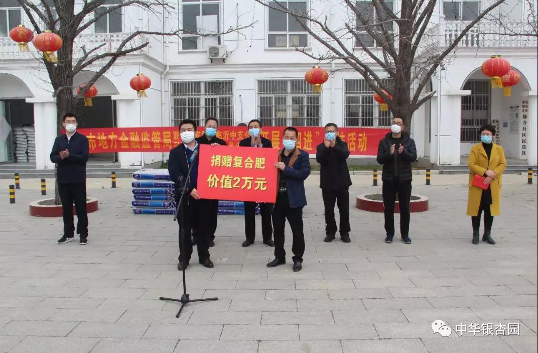 3月14日,市地方金融监管局联合平安产险临沂中心支公司到重坊镇吴道口村开展“四进”帮扶活动,向吴道口村捐赠价值2万元的复合肥。市地方金融监管局党组成员巩在秋、平安产险临沂中心支公司总经理焦晓伟、县地方金融发展服务中心主任潘月强、重坊镇党委书记刘凤康等出席捐赠仪式。