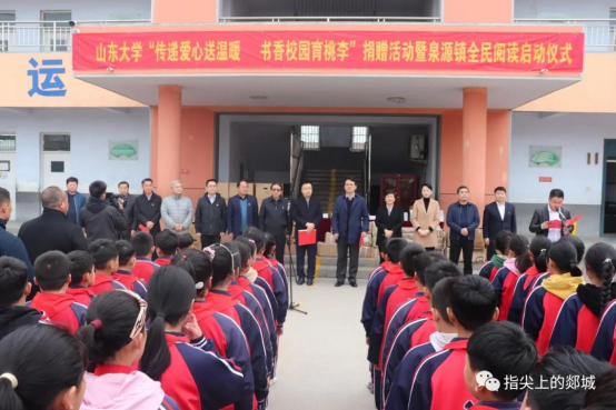 4月1日,山东大学“传递爱心送温暖 书香校园育桃李”捐赠活动暨泉源镇全民阅读启动仪式在泉源镇五湖小学举行。山东大学党委副书记王君松,县委副书记张霄,县委常委、宣传部部长郝玉芳,县委常委、组织部部长杨晓莉出席启动仪式。