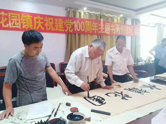 在花园镇党委二楼会议室,翰墨飘香,气氛热烈。来自全县的书画家们以“学党史、颂党恩”和庆祝中国共产党成立100周年为主题,纷纷挥毫泼墨,大家以笔代言,以纸为媒,用笔墨描绘祖国的大好河山,创作出一幅幅极富感染力的书画作品,抒发对党的敬爱之情和对祖国的美好祝愿,以此讴歌党的丰功伟绩,也营造了浓厚的文化氛围。