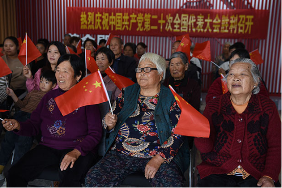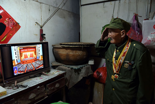 10月16日,在马头镇石站村,抗战老兵张德运在收看中国共产党第二十次全国代表大会开幕会。