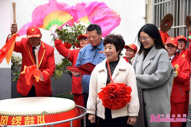 马头镇工作人员在锣鼓声中将荣誉证书送到“最美家庭”示范户王成爱(前中)的家。