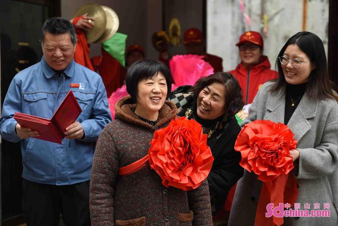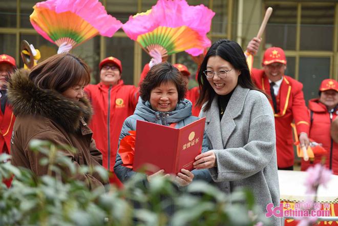 马头镇工作人员在锣鼓声中为“最美家庭”示范户樊玉侠(右二)戴上大红花