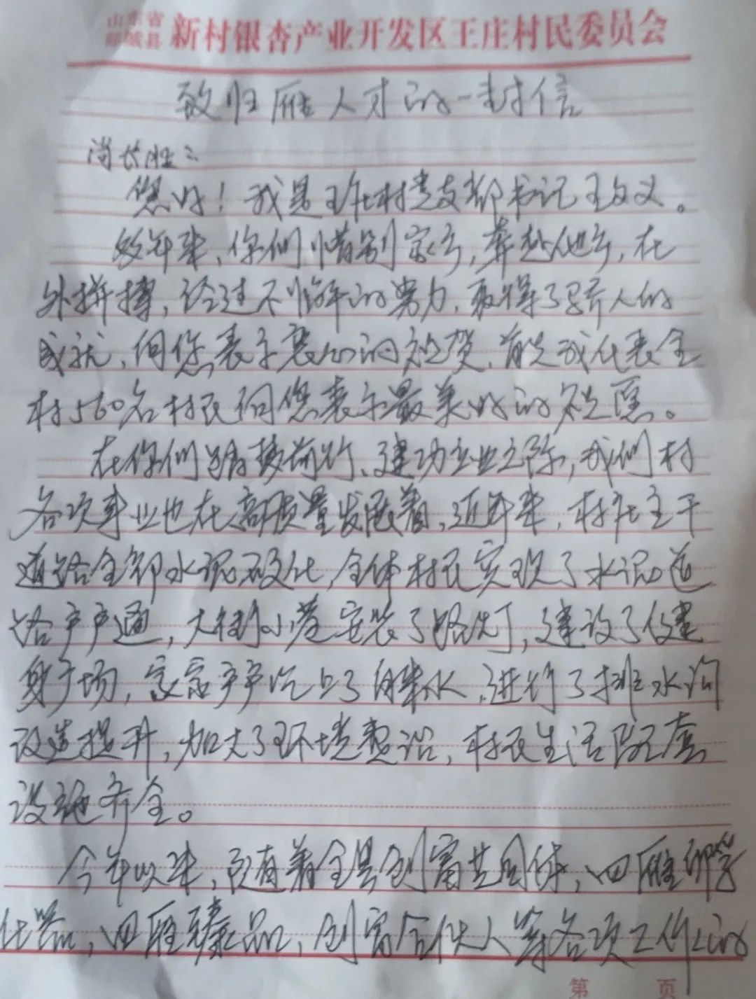 为进一步推进“四雁工程”取得实效,吸引“归雁”人才返乡助力乡村振兴,新村开发区各支部积极响应为在外人才写一封信号召,传递家乡近年来发展变化和相关人才政策,激发在外人才返乡干事创业激情。