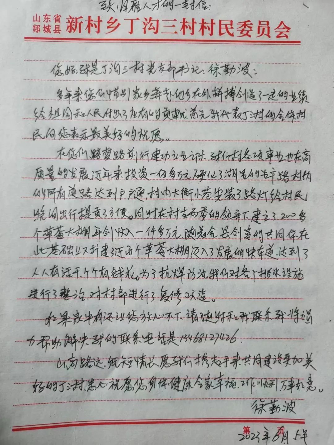 丁三党支部书记徐勤波在信中写到:近年来,我们村投资一百多万元硬化了生产路,村内实现了美化、绿化、亮化,党支部发挥引领作用,带动村民共富,全村建立了近百个草莓大棚,年产值一千多万元,草莓产业迈入了发展快车道,达到了“人人有活干 个个有钱花”的目标,全县创富共同体、四雁孵化器等各项工作开展,乡村也可大有作为,我们期待您回到家乡施展才华。