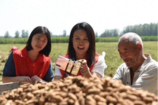 9月5日,马头镇西爱国村鑫恒农业种植农民专业合作社党员用直播的方式介绍花生的品质。