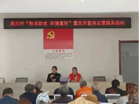 反诈宣传,守护老人“钱袋子”.为帮助老年人更好的适应信息化时代的生活方式,各村广泛开展“敬老助老 浓情重阳”暨反诈宣传志愿服务活动。活动中,普法志愿者结合近年来频发的老年人诈骗案例,详细讲解了常见的诈骗类型、作案手法、表现形式等内容,提醒老年人要做到“不听、不信、不转账、遇到诈骗第一时间报警、不贪图小利”,时刻提高警惕,看好自己的“钱袋子”,坚决不给犯罪分子可乘之机。