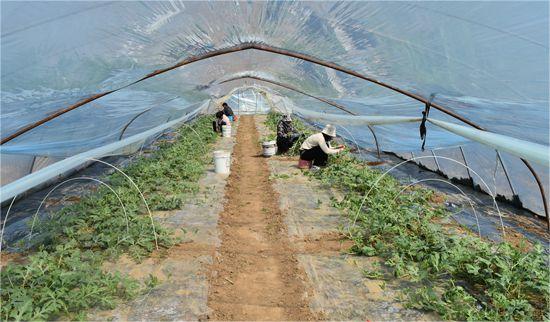 春分时节,在山东临沂郯城县杨集镇“美都”西瓜种植基地,1700个标准化白色塑料大棚整齐排列,在阳光的照射下甚是壮观。大棚内,西瓜苗新鲜细嫩,不少黄花、小果点缀其中,长势喜人。瓜农们正细心地翻看着藤蔓,整枝打芽,为西瓜创造更好的生长条件,确保西瓜如期上市销售。“通过考察,了解到与我们邳州毗邻的郯城县杨集镇一些地块非常适合西瓜的种植,加上西瓜生长周期相对短一些,收益也快,今年就跟杨集镇金土地服务有限公司与进行合作,建设了1700个标准化西瓜大棚,种植了1000亩‘美都’西瓜,‘五一’期间西瓜可成熟上市,预计亩产量可达到8000斤,按照现在的市场行情亩效益3万多元很有把握!”有着22年西瓜种植经验的江苏邳州西瓜种植大户李向成谈及跨省到郯城县杨集镇种植西瓜的初衷,脸上溢满了幸福的笑容。