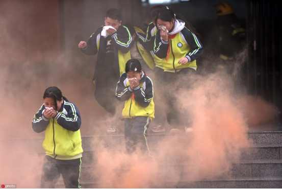 2024年3月25日,马头镇中心小学,学生在消防员的指导下进行疏散逃生演练。