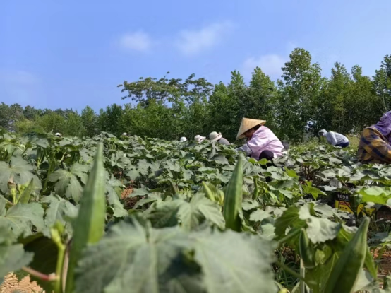 眼下,正是秋葵的收获期。在重坊镇东高庄村秋葵种植基地,380多亩的秋葵喜获丰收,淡黄色的秋葵花开满田地,在阳光的照射下一根根翠绿欲滴的秋葵挂满枝头,长势喜人。工人们正穿梭在田地里采摘成熟的果实,经过分拣、打包,进行保鲜冷藏后再发往江苏等地进行加工和销售。