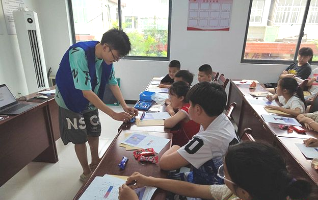 实践队员给参加活动的小学生送上学习文具,拉近彼此距离。科普讲座开始后,实践队员讲解电学和磁学科普。队员贲禹默从生活中的用电场景引入,介绍了常见的发电设施、多样的发电方式、基础电路讲解。通过有趣的摩擦生电实验和基础电路搭建,传授了电的传导知识,强调了用电安全和节约用电的重要性。
