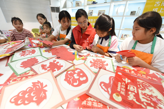 2024年8月14日,在山东省临沂市郯城县马头镇黄金殿村新时代文明实践站活动室,公益暑托班的孩子们在青年志愿者徐勤瑞(右三)的指导下学习剪纸。