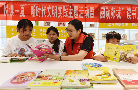 暑假期间,郯城县马头镇依托农村社区新时代文明实践站活动室,开设公益爱心暑托班,组织青年志愿者带领参加托管的小朋友开展剪纸、绘画、别样阅读、手工制作等形式多样的学习体验活8月14日,郯城县马头镇黄金殿村新时代文明实践站阅览室,青年志愿者徐利芹(右二)陪伴公益暑托班的孩子们阅读、学习。动,缓解外出务工人员子女暑期看护难题,丰富孩子们的暑期生活。