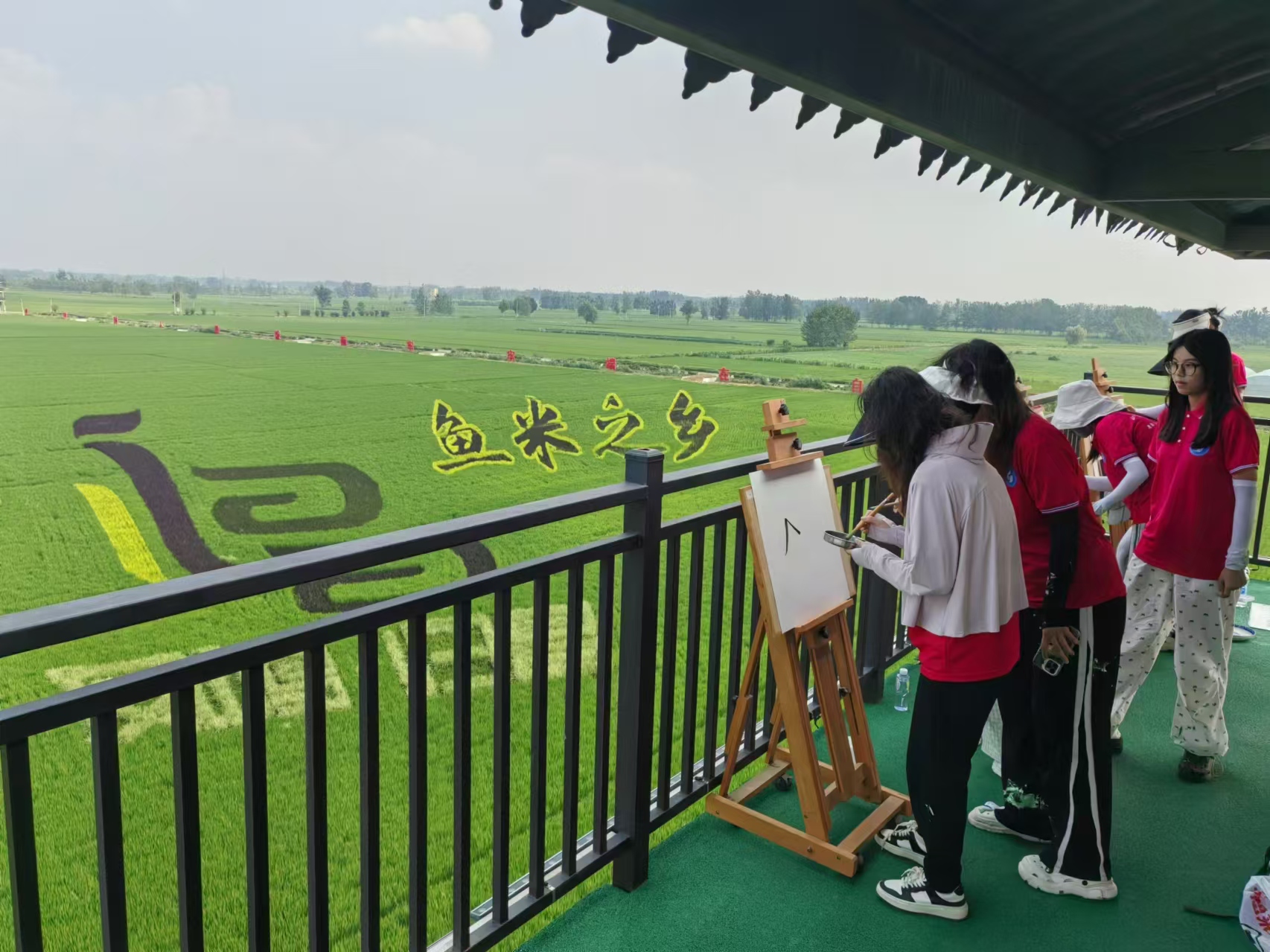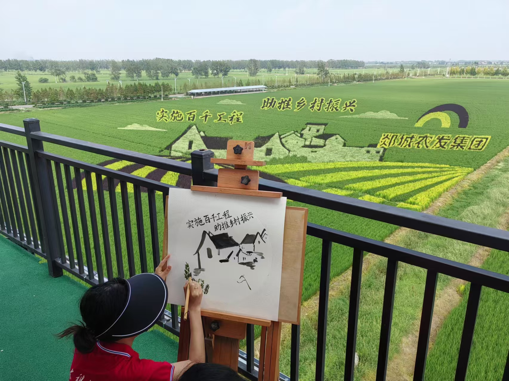 归昌乡姜湖贡米农业产业园内,一群小学生在乡新时代文明实践所志愿者的带领下,来到“稻梦空间”观光台上,一边欣赏稻田美景,一边用手中的画笔描绘“稻田画”的美景。