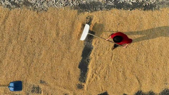 8月24日,临沂市郯城县马头镇柏花园村,玉米种植农民专业合作社社员在晾晒刚收获的今年第一批春玉米。