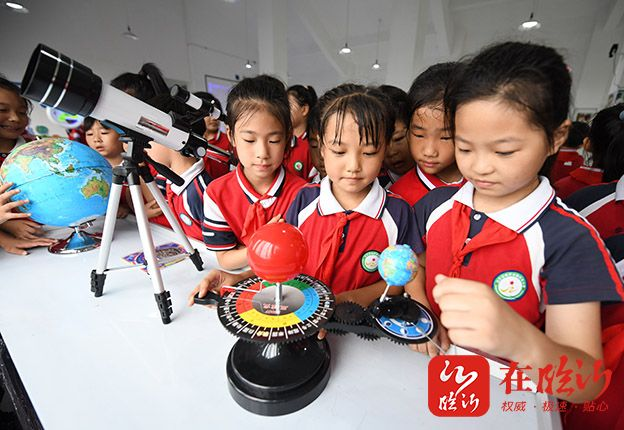 ▲在郯城县马头镇马西村“乡村科普馆”,求是小学的学生们入馆体验各种高科技。