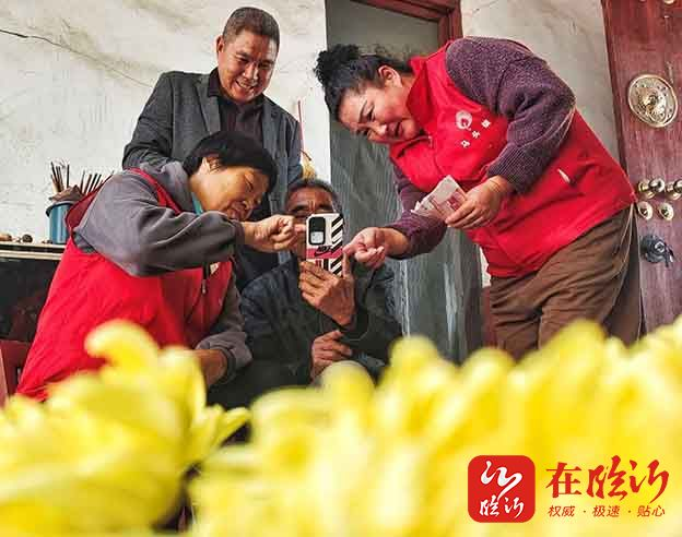 10月28日,在郯城县马头镇二刘庄村,志愿者与村干部一起入户,指导村民们如何使用手机微信小程序轻松缴纳医疗保险费。