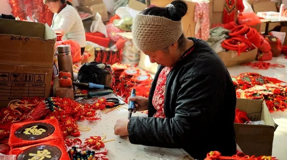2021年,郯城中国结传统编织技艺被列入山东省第五批非物质文化遗产代表性项目名录,传承千年的古法技艺在如今也得到了社会各界认可。“我们镇现在中国结生产企业、中国结电商近400家,生产出来的中国结在咱们全国市场份额中占比超过70%。”红花镇党委书记郑庆永自豪地说。