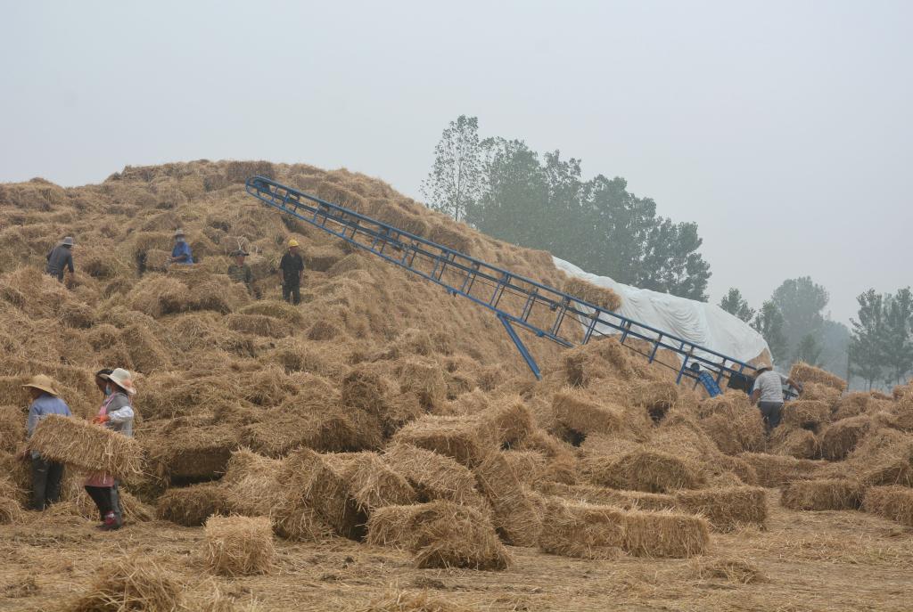 图一归昌二村秸秆收储中心员工在忙碌堆垛。