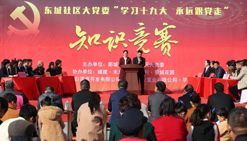10月29日上午,东城社区大党委“学习十九大 永远跟党走”知识竞赛在社区楼前举行。来自县委政法委、县法制局、县文广新局、县教体局、县人社局等9个驻区单位的在职党员代表与9名社区党员代表组成6支代表队进行现场角逐。本次竞赛设必答题、抢答题和风险题。最终,由县商务局和张卸、葛庄党员代表组成的4号代表队拔得头筹。竞赛过程中穿插舞蹈、音乐、器乐演奏、观众互动等环节,主题鲜明、形式新颖、内容紧凑,受到现场观众的一致好评。
