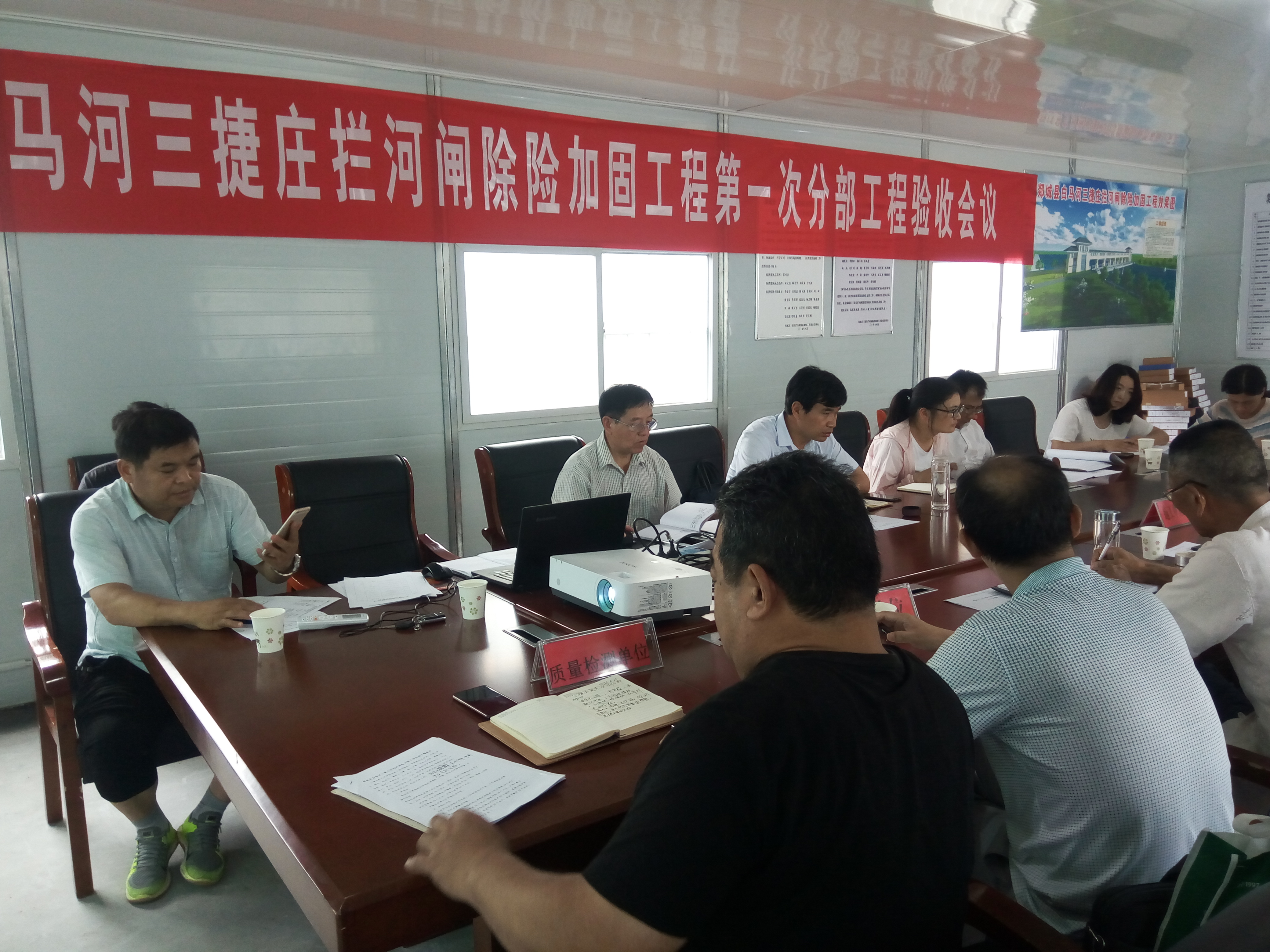 本次验收工作包括闸室段、消能防冲段、下游连接段和交通桥工作桥检修桥等4个分部工程验收。本次验收成立了郯城县白马河三捷庄拦河闸除险加固工程验收小组,验收小组首先查看工程现场,又听取了施工、监理、检测、设计等单位的汇报,还查阅了工程档案资料。经过讨论,验收组一致通过了第一次分部工程验收,并形成了鉴定书。项目法人陈乃学对下步工作提出了三点要求:一是各单位完善好档案资料;二、当前已经进入汛期,施工单位要做好防汛值班,确保工程安全度汛。