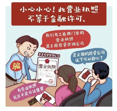 11、不法分子对外宣称有工商部门核发的营业执照,经营范围列明投资管理、投资咨询等,以此表明具备相关资质,诱骗投资人放心投资。而事实上,根据法律规定,从事吸储等金融业务必须经过相关金融监管部门的严格审查,方能核发许可证。投资管理、投资咨询与从事吸储根本不是一回事。