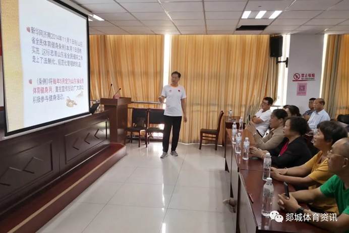 8月27日,山东省全民健身志愿宣讲郯城站培训会议在县体育发展中心会议室举行。县各健身站点负责人、郯城街道各社区社会体育指导员、县体育场健走队成员等100余人参加。