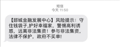 一是发送防范非法集资公益短信。以春节期间外出打工人员返乡为契机,向城区和各乡镇的中小企业主、返乡人员、农村居民等重点群体发送防范非法集资公益短信20万余条。