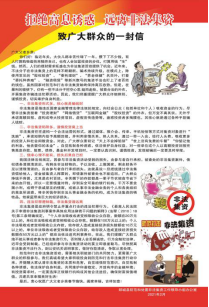 三是制作《一封信》海报及宣传音频。为贴近农村和社区居民,制作了《拒绝高息诱惑,远离非法集资-给全县人民的一封信》宣传海报1000份和宣传音频,通过在村街人群集中位置张贴、“村村响”播放等形式,针对以养老保健、互联网金融、消费返利等名义开展的非法集资行为开展重点宣传,及时揭示非法集资的形式,向广大群众提示金融风险。