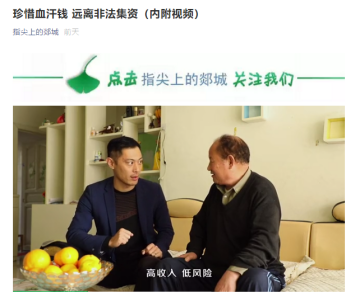 二是拍摄防范非法集资宣传教育微电影。紧紧围绕“守住钱袋子护好幸福家”宣传主题,基于真实的防非故事事件,创作防范非法集资宣传教育微电影,有针对性且力求生动地普及防范非法集资知识。目前,微电影通过政府网站、微信公众号、广播电视台、路口显示屏等途径发布,通过身边故事提醒广大群众远离非法集资。