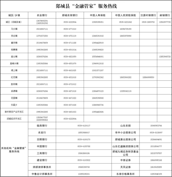 为抓好国家、省、市、县统筹抓好疫情防控和经济社会发展政策落实,帮助市场主体纾困解难,打通银企供需对接的“最初一公里”和金融政策落实的“最后一公里”,郯城县结合市地方金融监管局“学理论、悟思想、见行动、创一流”活动要求,持续深化“金融管家”试点工作,主动作为、迅速行动,在前期全省率先开通“金融管家”服务直通车微信平台基础上,又在全市率先开通“金融管家”服务热线,涵盖银行、保险、担保、证券、基金、会计、律师等多个领域,不断提高普惠金融服务的可得性、便利度和满意度。目前,郯城县共设置城区“金融管家”服务热线22部,乡镇“金融管家”服务热线45部,实现全县城区及乡镇全覆盖。城区及各乡镇“金融管家”服务热线电话如下: