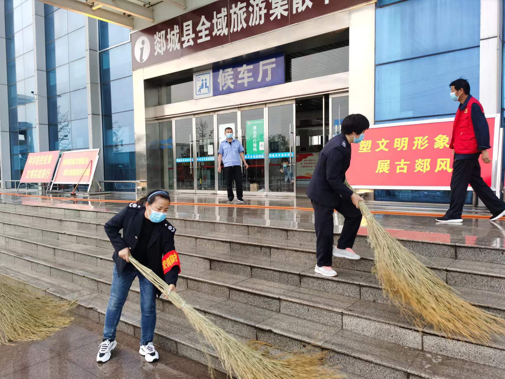 对主城区主要干道的公交停靠点,站点棚进行了清洁,并在站内利用led屏滚动播出文明出行文明交通标语口号,营造了浓厚的创城氛围。增设固定宣传牌13处,景观小品1处,对车站周边环境进行了清洁整治。执法大队专门抽调一个中队,对车站周边车辆乱停,非法运营,占道经营等行为进行集中整治。规范车站从业人员文明用语,做好乘客出行服务,督促从业人员穿着整洁,大方得体,规范停靠车辆。同时结合疫情防控,督促乘客带好口罩,保持一米线安全距离,有序排队,文明购票,扫码上车,督促乘务人员及时对车辆进行清洁打扫,时刻保持周边环境干净整洁。