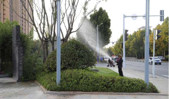 及时浇灌促生长。在提前做好公园广场灌溉设备的检修工作的基础上,各公园广场管理部门按照“浇足浇透”原则,利用高压喷枪及人工灌溉对苗木进行冲灌对城区内公园、广场及道路绿地植物浇灌返青水,确保植物生长所需水分。