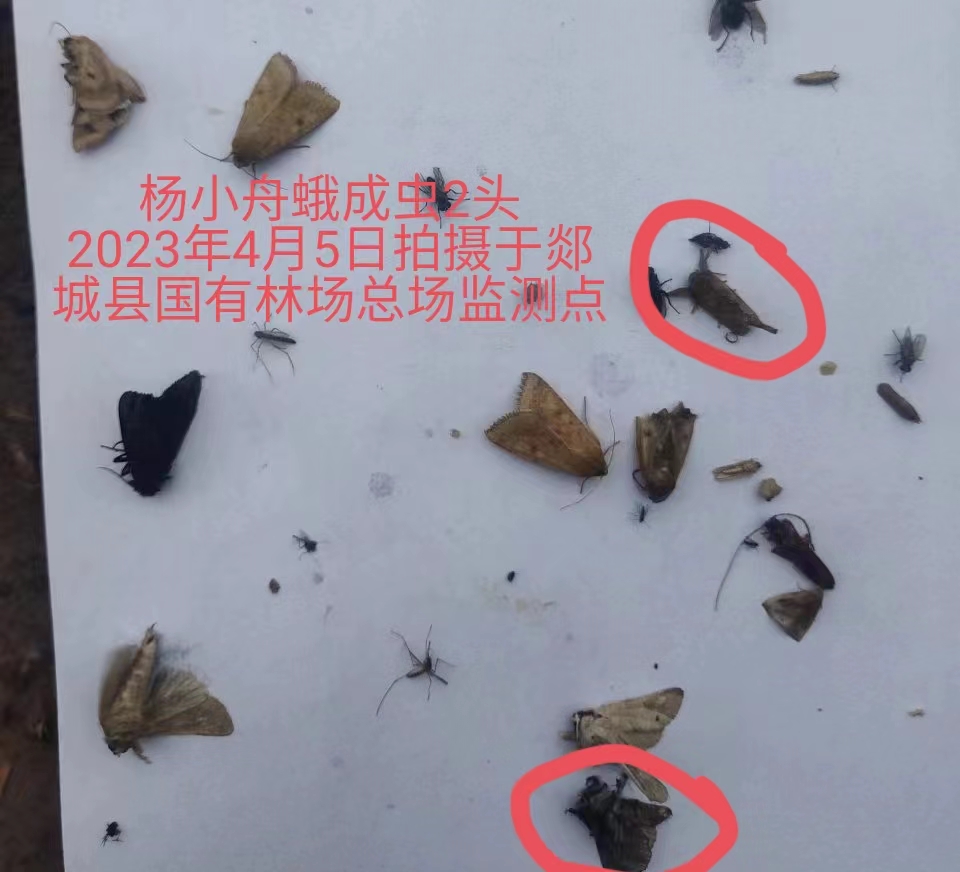 4月5日在郯城县国有林场总场监测点首次发现杨小舟蛾越冬代成虫2头,表明我县杨小舟蛾越冬代成虫进入羽化始见期。根据往年杨小舟蛾发育历期,初步预测杨小舟蛾成虫羽化高峰期为4月下旬。