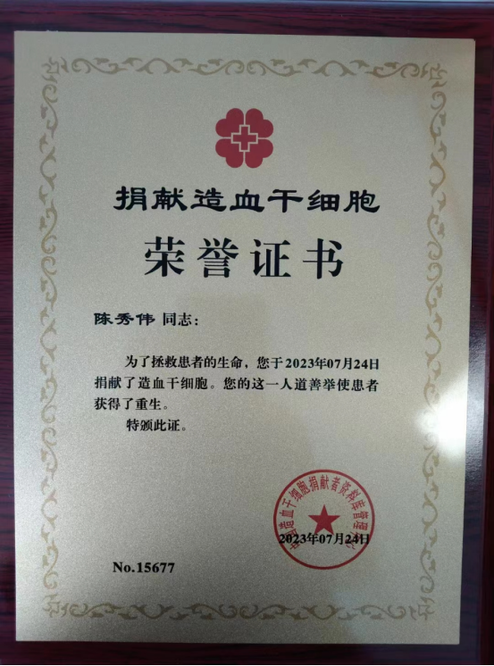 “终于完成捐献了,就像一块石头终于落了地,希望这名孩子接受了干细胞移植后,可以平安快乐地成长。”陈秀伟表示,捐献造血干细胞其实并不可怕,也没想象中那么复杂,就是感觉腰有点点酸,也没有其他症状。希望通过自己的亲身经历,能够让大家对造血干细胞捐献有更多的正确的了解,也希望越来越多的人能加入到中华骨髓库,让那些在绝望中苦苦等待的血液病患者们有机会好好活下去。