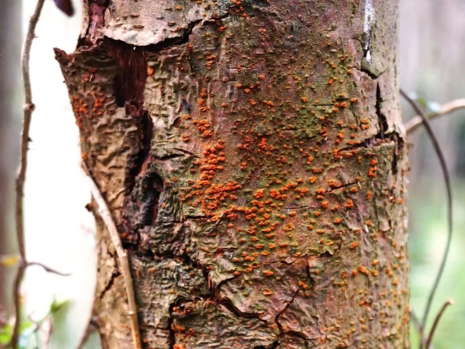 发生与危害:苗木和大树均可受害,主要为害主干、侧枝及枝条,结果树病害多发生于主枝基部及桠枝处。板栗疫病病原菌自伤口侵入主干或枝条后,形成黄褐色至褐色病斑,剥开粗糙的树皮,受害处呈深褐色至黑褐色,韧皮部变色死亡,有酒糟味。树皮干缩纵裂,剥开枯死树皮,有污白色至淡黄色扇形菌丝体。当病斑环绕主干时,造成整株死亡。