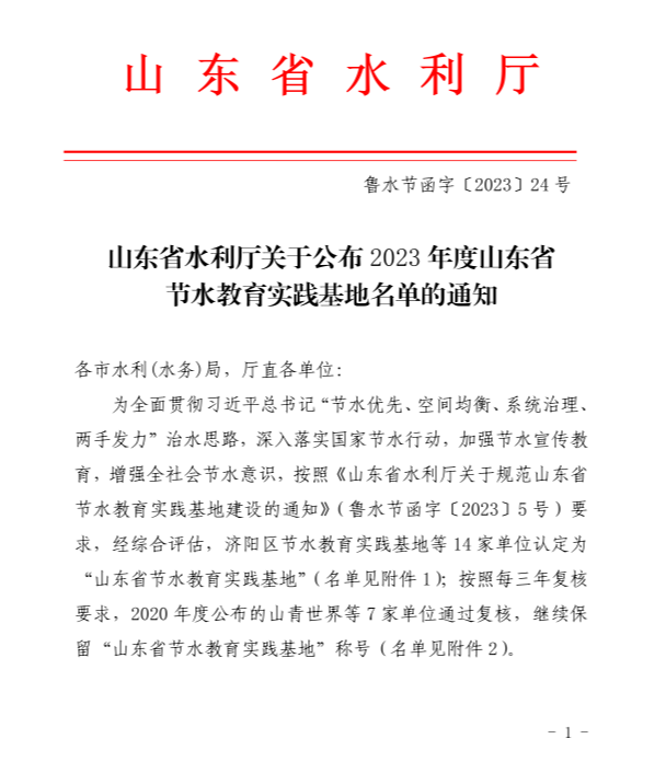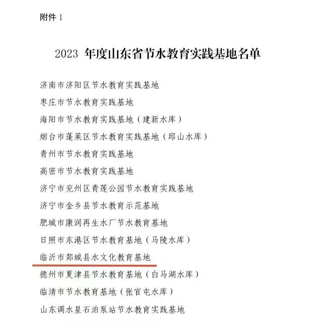 近日,山东省水利厅印发了《山东省水利厅关于公布2023年度山东省节水教育实践基地名单的通知》(鲁水节函字﹝2023﹞24号),我县水文化教育基地成功创建成省级节水教育实践基地。