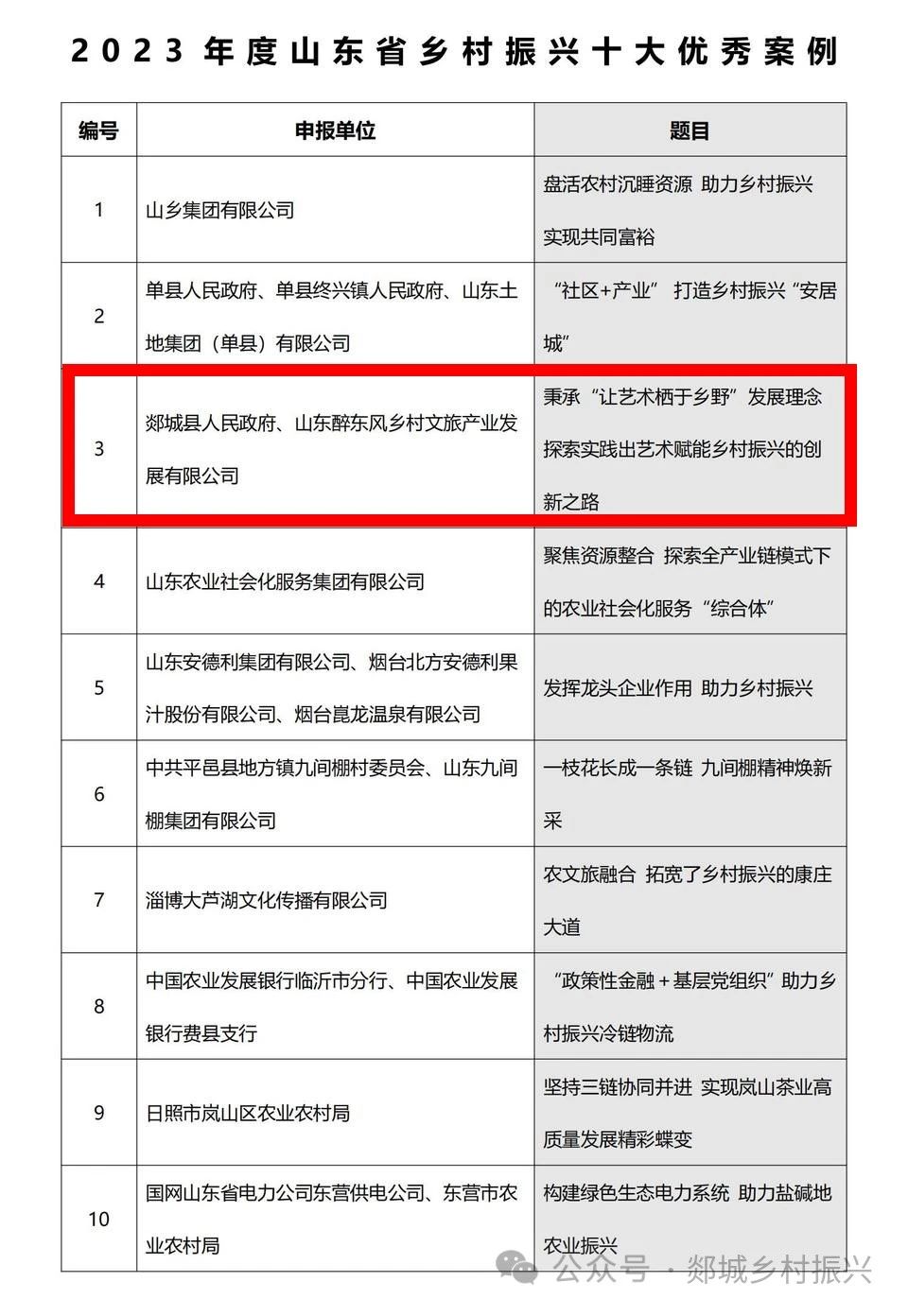 1月3日,由山东省农业农村厅(山东省乡村振兴局)、山东社会科学院指导,山东省乡村振兴研究会主办,山东社会科学院农村发展研究所、山东文旅集团、齐鲁晚报•齐鲁壹点承办的2023年山东省“乡村振兴优秀案例”评选结果开始公示。其中,郯城县人民政府与山东醉东风乡村文旅产业发展有限公司申报的《秉承“让艺术栖于乡野”发展理念 探索实践出艺术赋能乡村振兴的创新之路》获评“2023年度山东省乡村振兴十大优秀案例”。