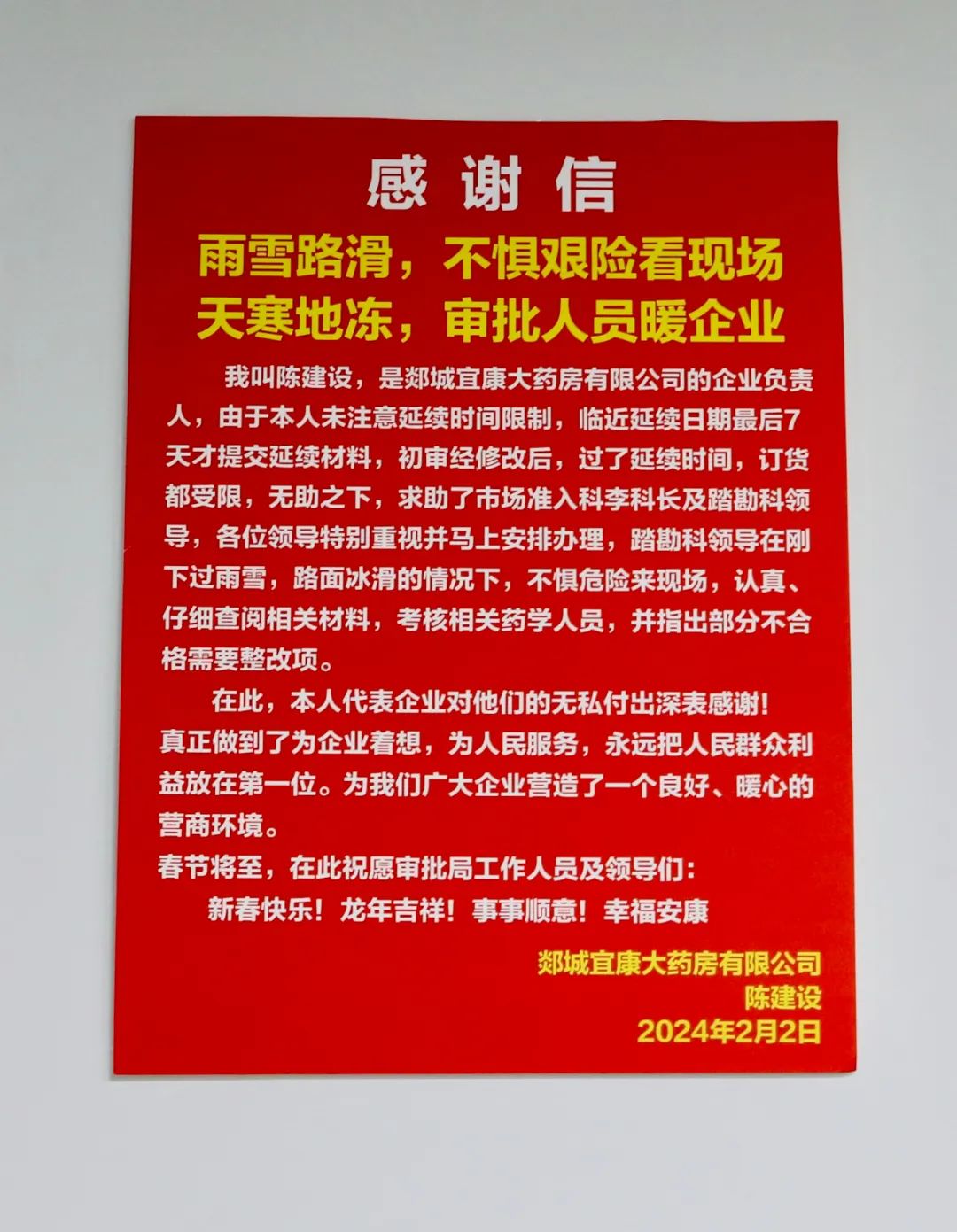 高效便捷的审批,细致贴心的服务,让企业在凛凛寒冬感受到了温暖,在工作人员完成审批的同时,药店负责人陈先生也送来感谢信,对县行政审批服务局工作人员表达了真挚感谢。