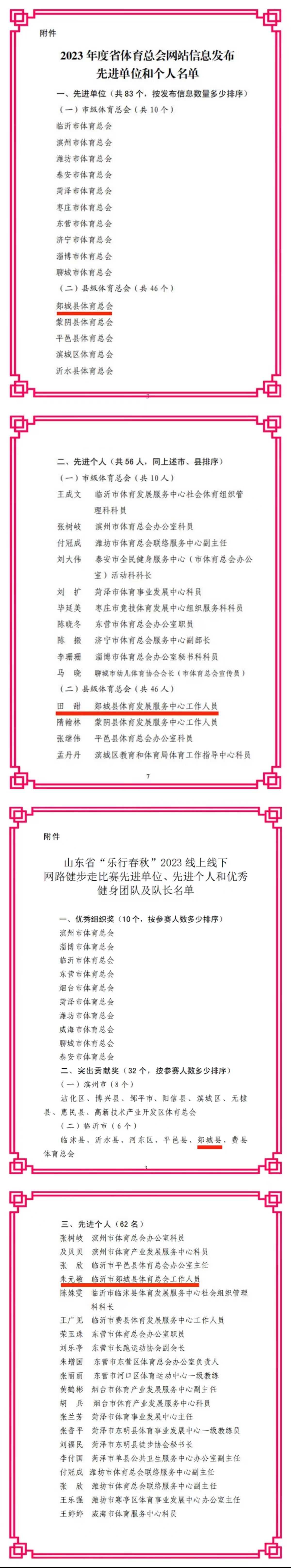 近日,山东省体育总会发文对2023年表现突出的各市县体育总会进行表彰。我县体育总会荣获两个奖项:一是获得2023年度山东省体育总会网站信息发布先进单位,田甜同志被评为先进个人;二是获得山东省“乐行春秋”2023线上线下网路健步走比赛活动先进单位,朱元敬同志被评为先进个人。