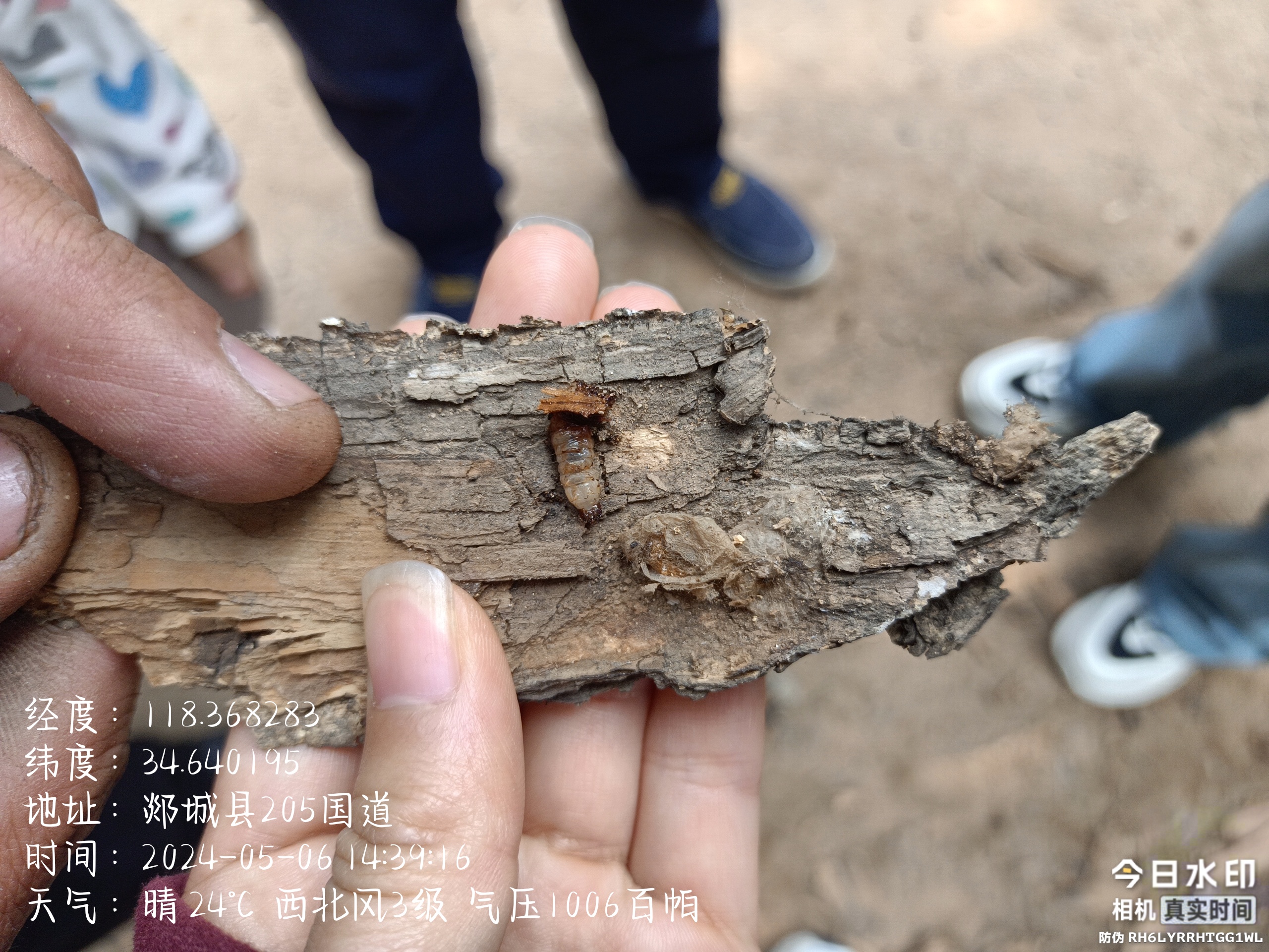 5月6日,我县国家级林业有害生物中心测报点工作人员在郯城街道后东庄村开展林业有害生物调查,调查发现板栗透翅蛾越冬代幼虫危害。
