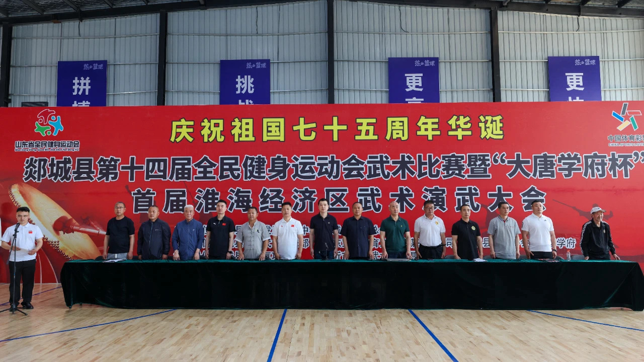 郯城县体育发展服务中心副主任冯飞宣布:”庆祝祖国七十五周年华诞”郯城县第十四届全民健身运动会武术比赛暨首届淮海经济区“大唐学府杯”武术演武大会开幕!
