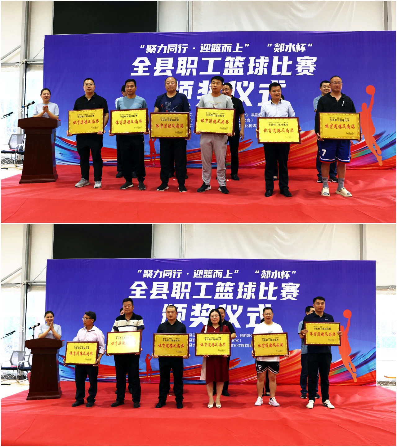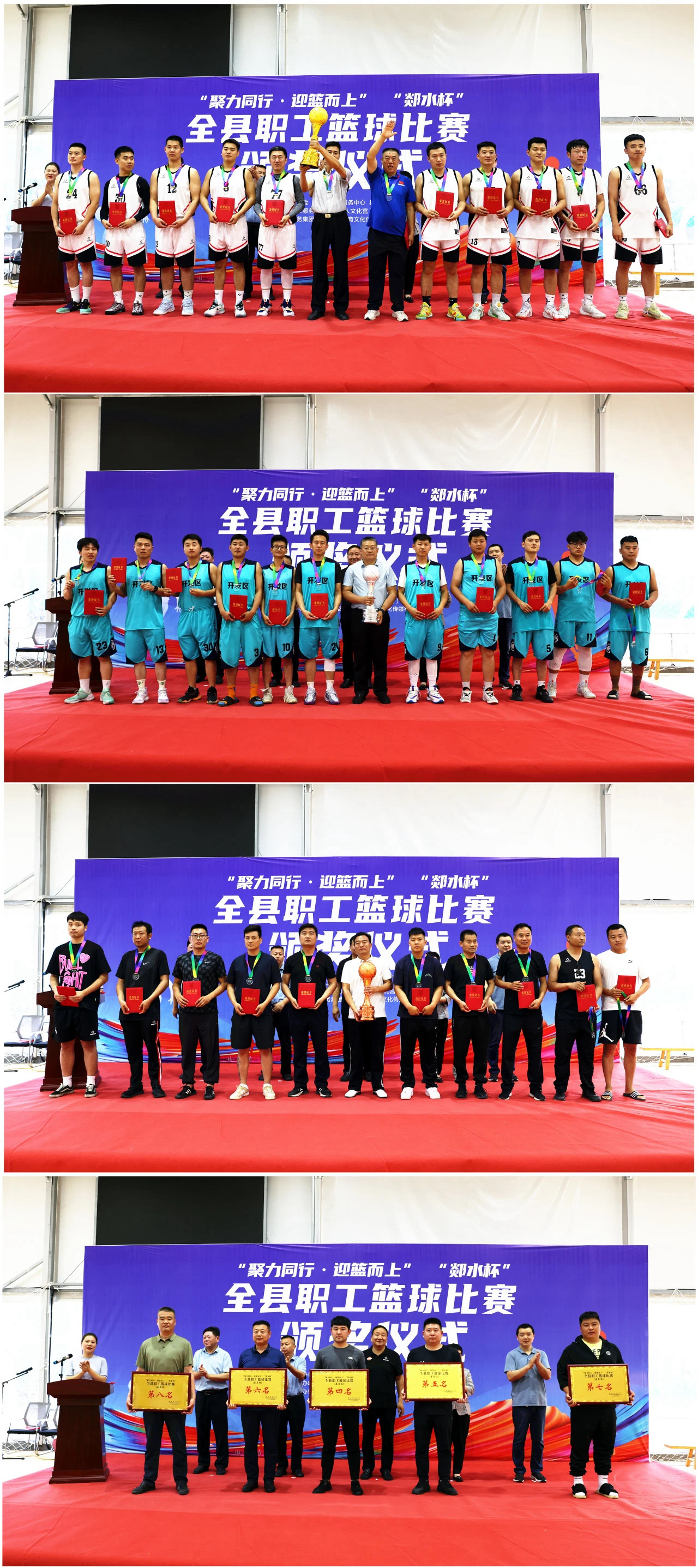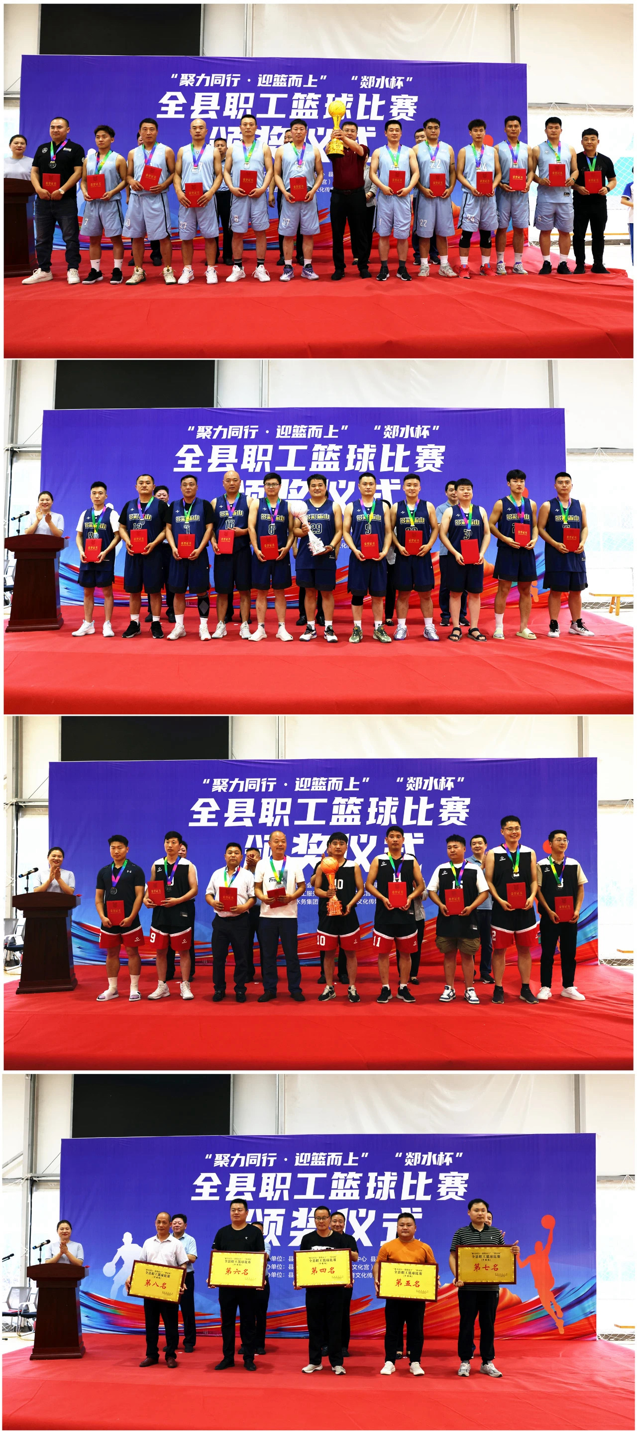 经过一周74场激烈的角逐,5月22日下午,郯城县“郯水杯”职工篮球比赛完成全部赛程。县人大常委会副主任、县总工会主席王柏亮;县总工会党组书记、常务副主席蒋欣平;县融媒体中心主任沈艳;县体育发展服务中心副主任冯飞;县水务集团党委书记、董事长潘月强以及竞赛委员会负责同志出席闭幕式并为获奖代表队颁奖。