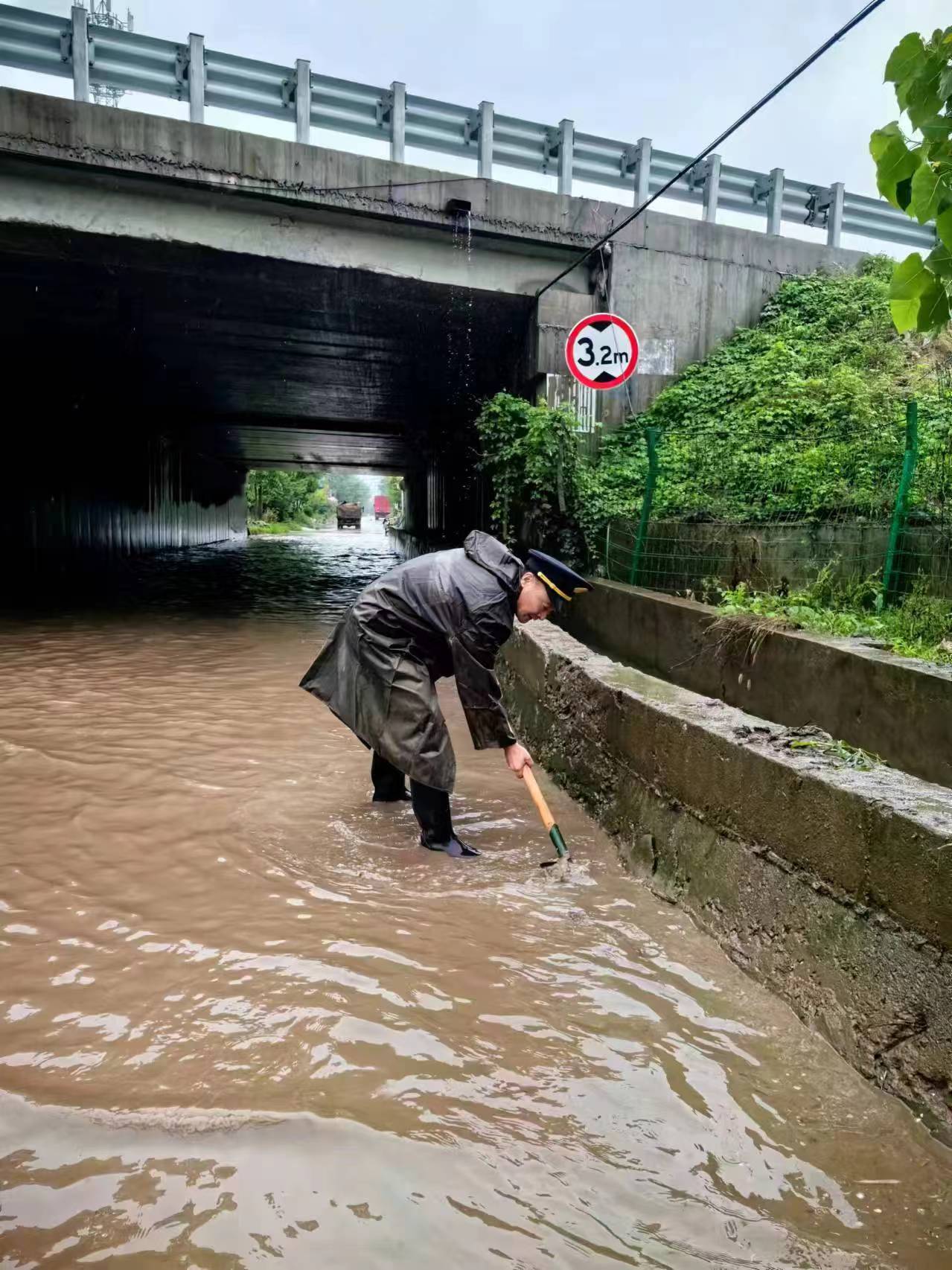 在马头镇赵庄高速涵洞西侧,工作人员正疏通排水设施。狭窄的作业空间里,工作人员徒手将堵塞排水口的垃圾、污泥清出,经过半小时的努力,排水设施开始正常运转,路面的积水逐渐消退。
