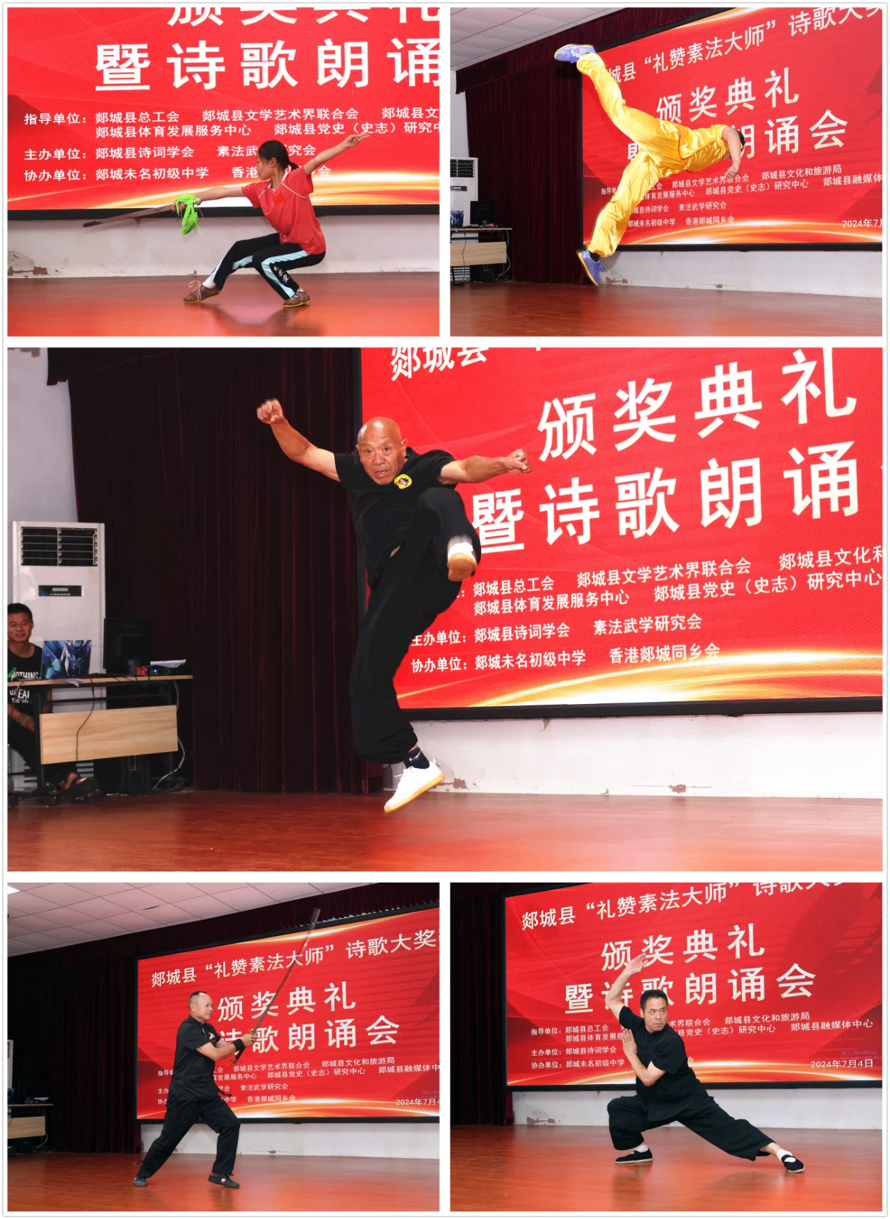 英如本、刘旭平和刘明祥三位同志分别在会上致辞。据了解,为弘扬武术精神,深切缅怀素法大师对武术事业所做出的巨大贡献,郯城素法武学研究会联合县诗词学会举行了本次《礼赞素法大师》诗歌征文比赛,共收录作品136首,评出一、二、三等奖和优秀奖。一首首脍炙人口的诗歌,将素法大师不平凡的人生歌咏。